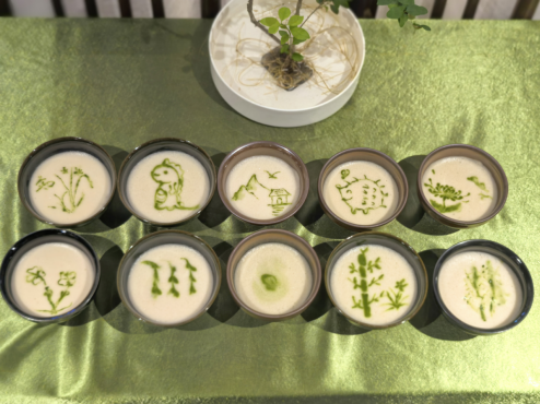 活動(dòng)的高潮,無(wú)疑是仿宋點(diǎn)茶體驗!這不僅是喝茶,更是一場(chǎng)古老的“咖啡拉花”藝術(shù)。大家用茶筅奮力擊拂,打出綿密沫浡,然后用茶粉為墨,在茶湯上自由創(chuàng )作。剎那間,茶盞變成了畫(huà)布:有的伙伴畫(huà)了一只憨態(tài)可掬的刺猬,有的則勾勒出霸氣的恐龍,還有清雅的竹、出淤泥而不染的荷…… 奇思妙想層出不窮,現場(chǎng)充滿(mǎn)了歡聲笑語(yǔ)。這份獨特的體驗,讓我們深刻感受到了宋人的風(fēng)雅與無(wú)窮的創(chuàng )造力。